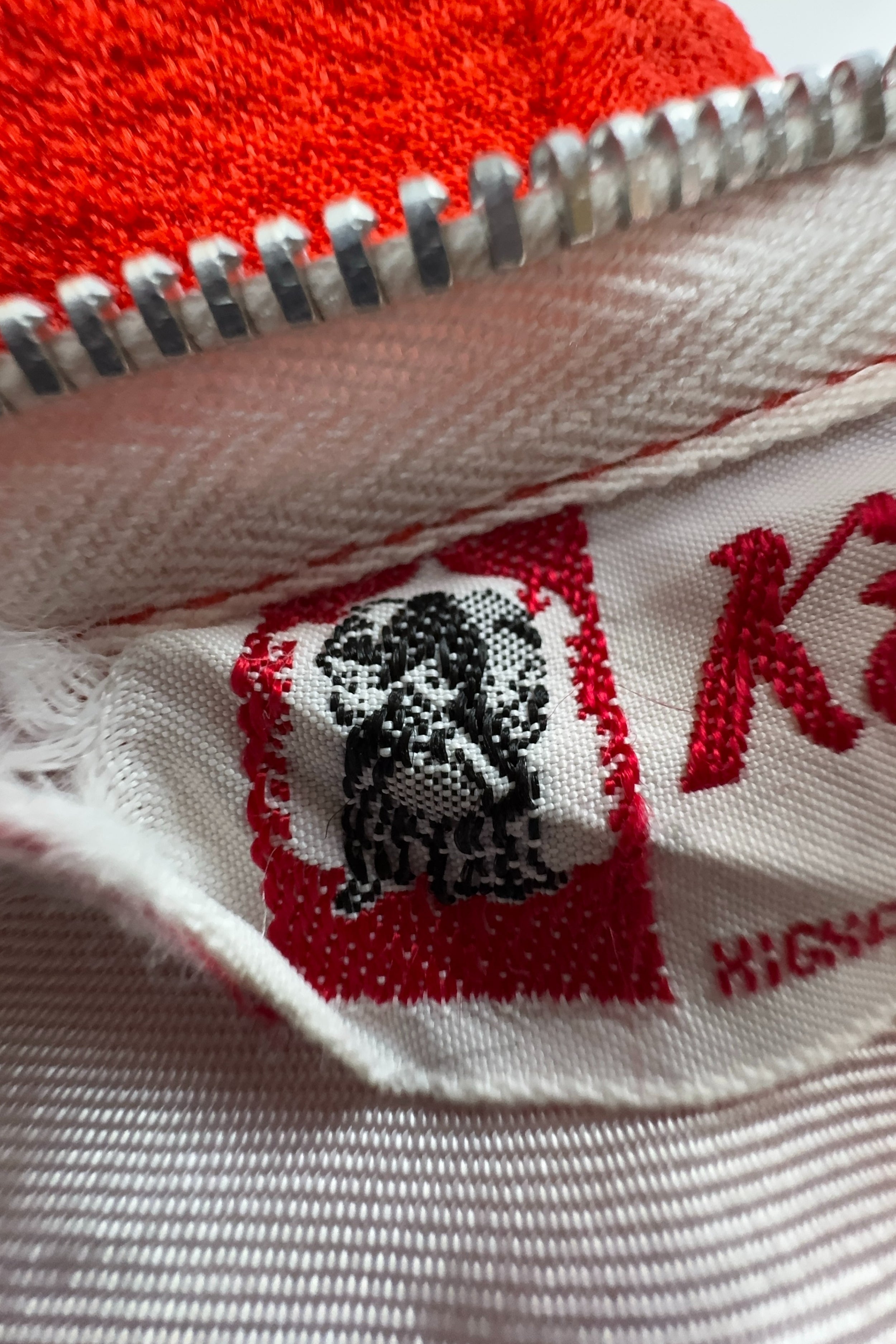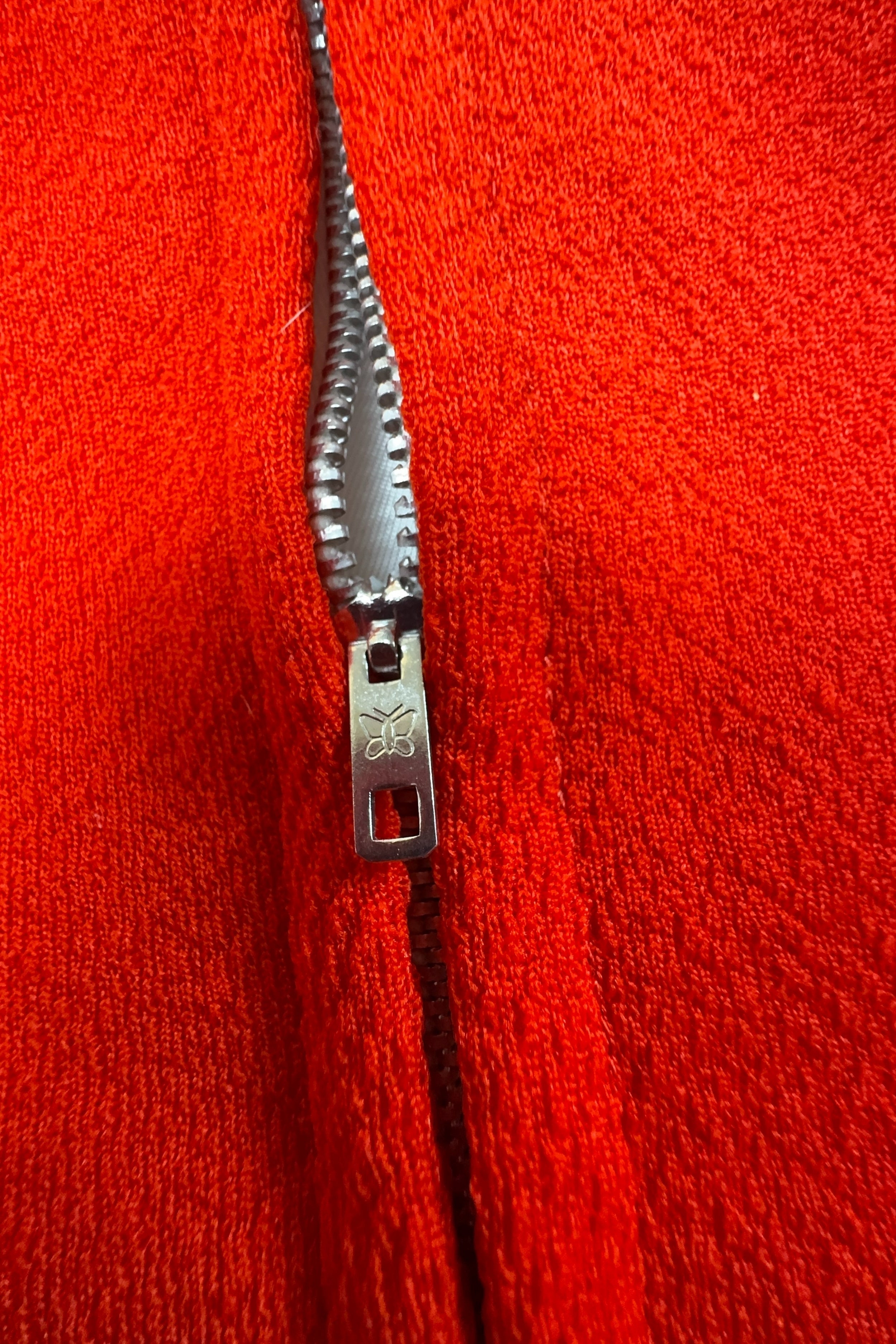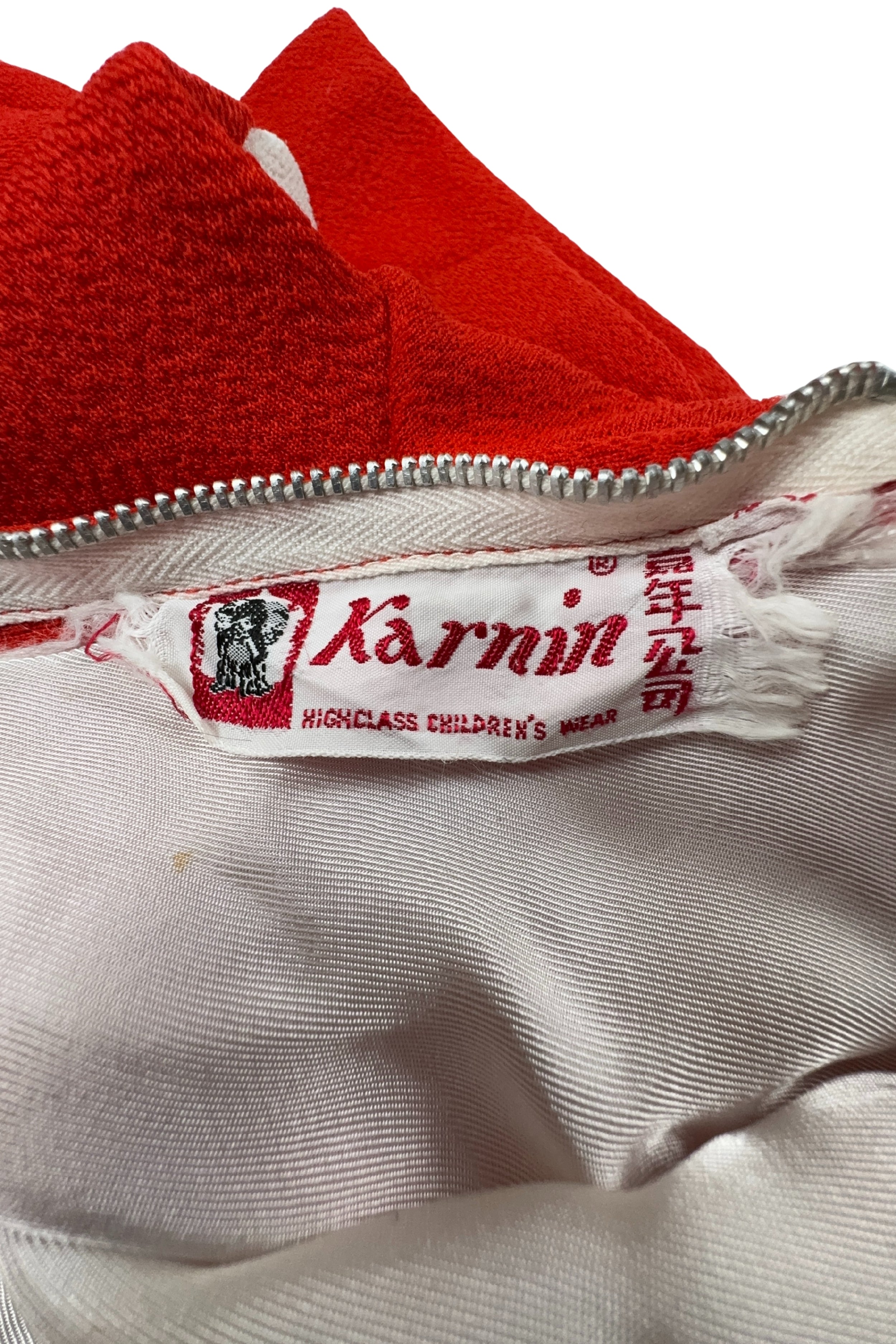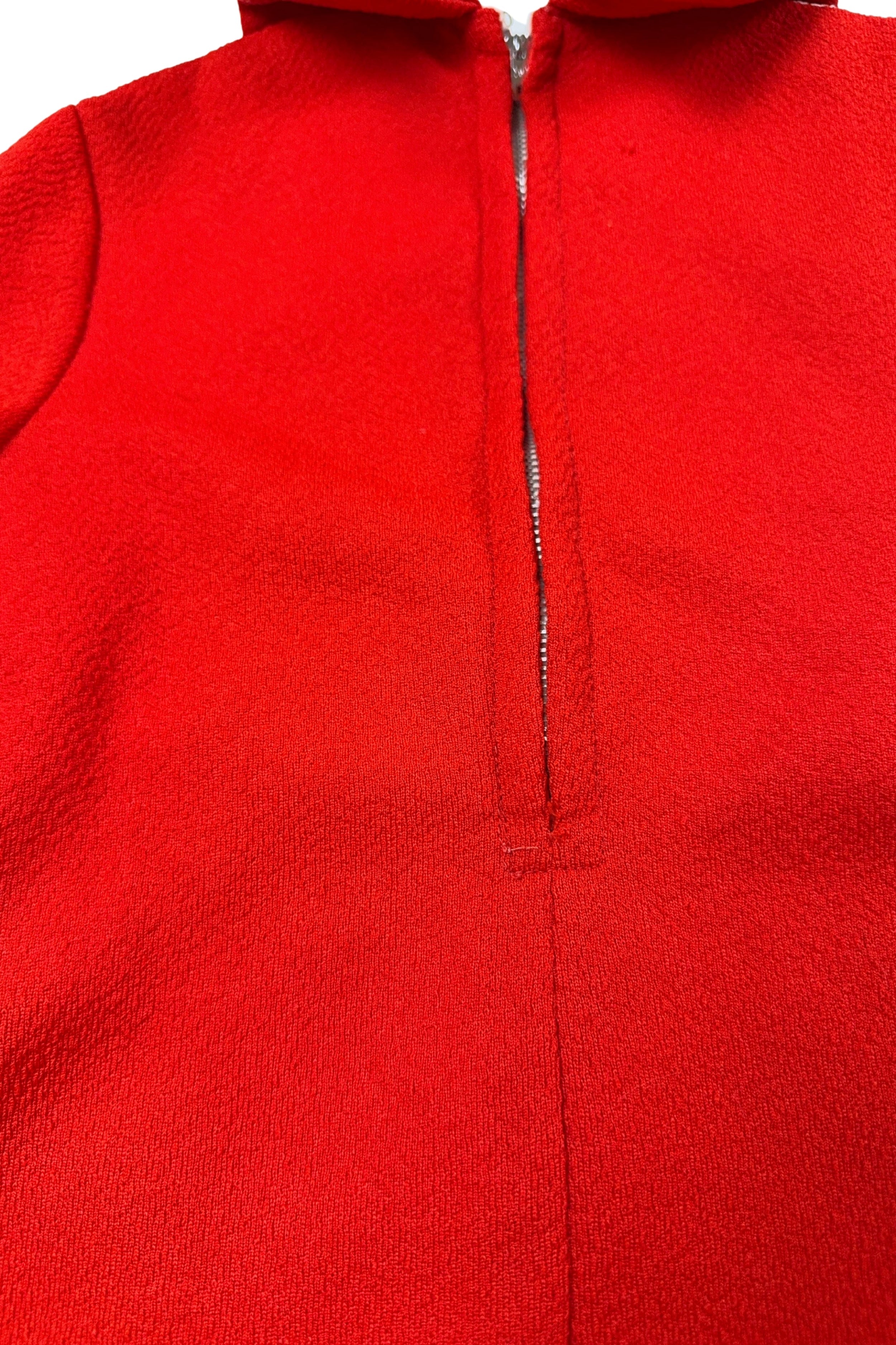Vintage 1970s children’s dress with red skirt and sleeves, white bodice, and red pointed collar and matching pocket. The bodice and skirt feature contrasting navy blue stripes vertically and horizontally. Three decorative buttons at the neck finish this perfect late-mod look. The dress closes with a metal zipper in the back, and is fully lined in dove grey rayon.