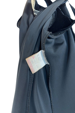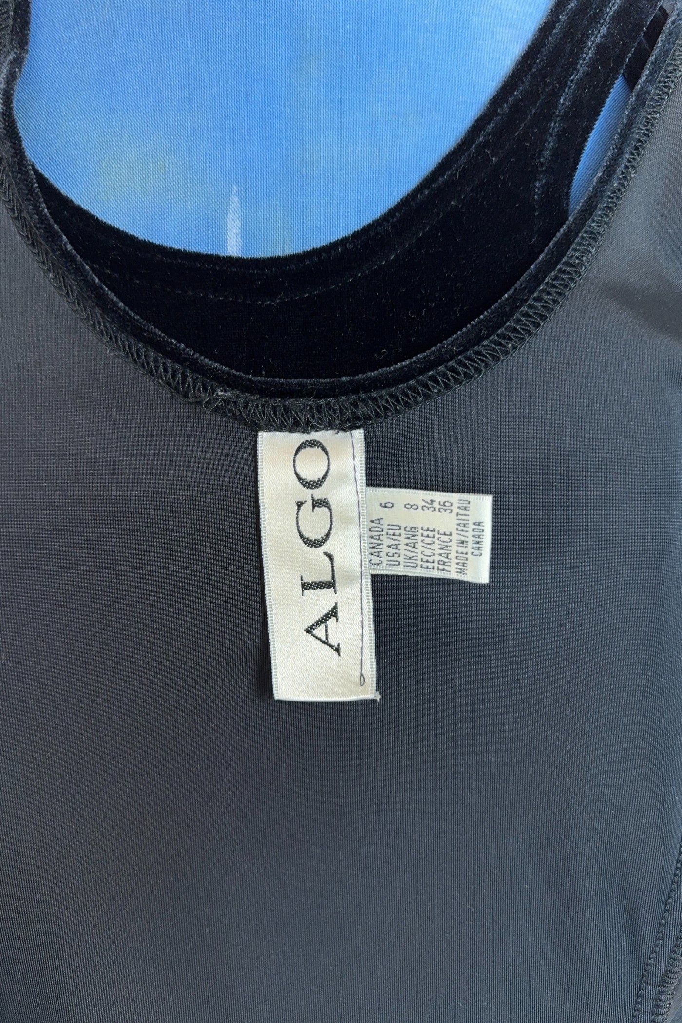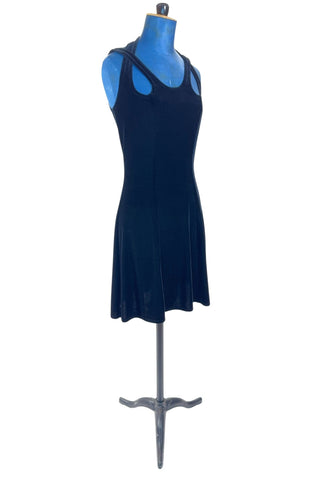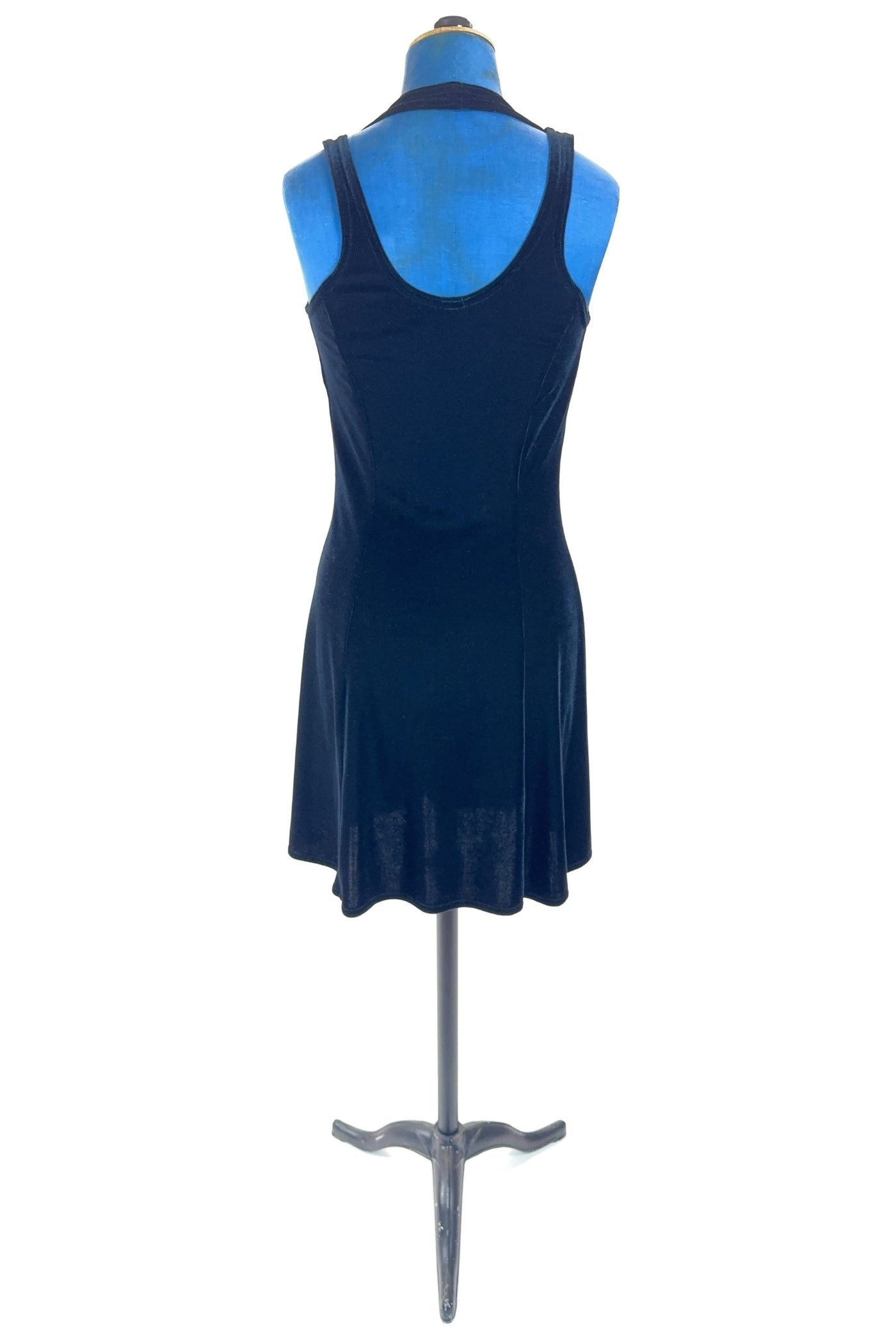 You've found it: the perfect 90s little black dress. This vintage 1990s black velvet party dress has eye-catching layered straps that create a double halter neckline and round neckline. The dress has flattering princess seams to create an hourglass silhouette. The length hits above the knee. Time to party like it's 1995!
