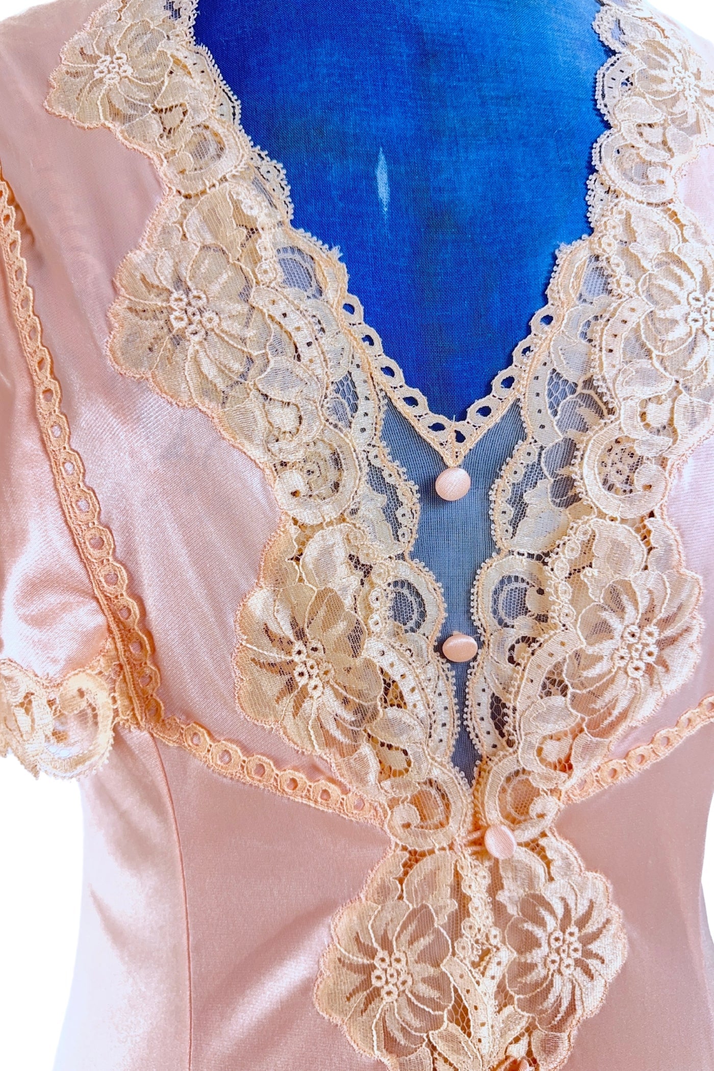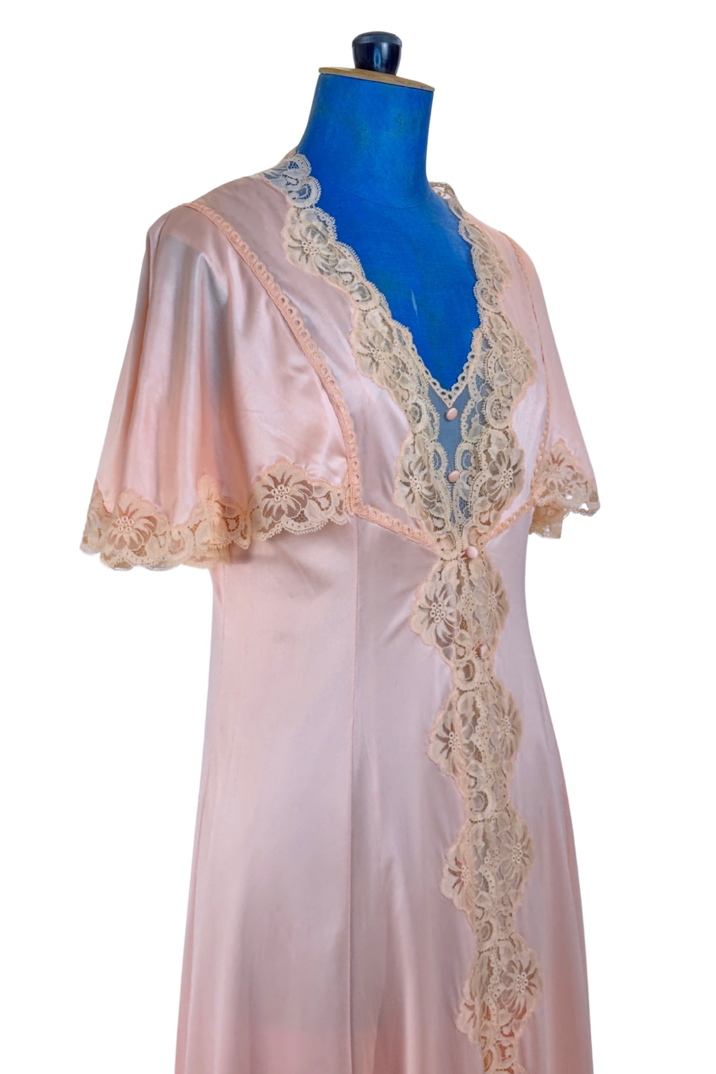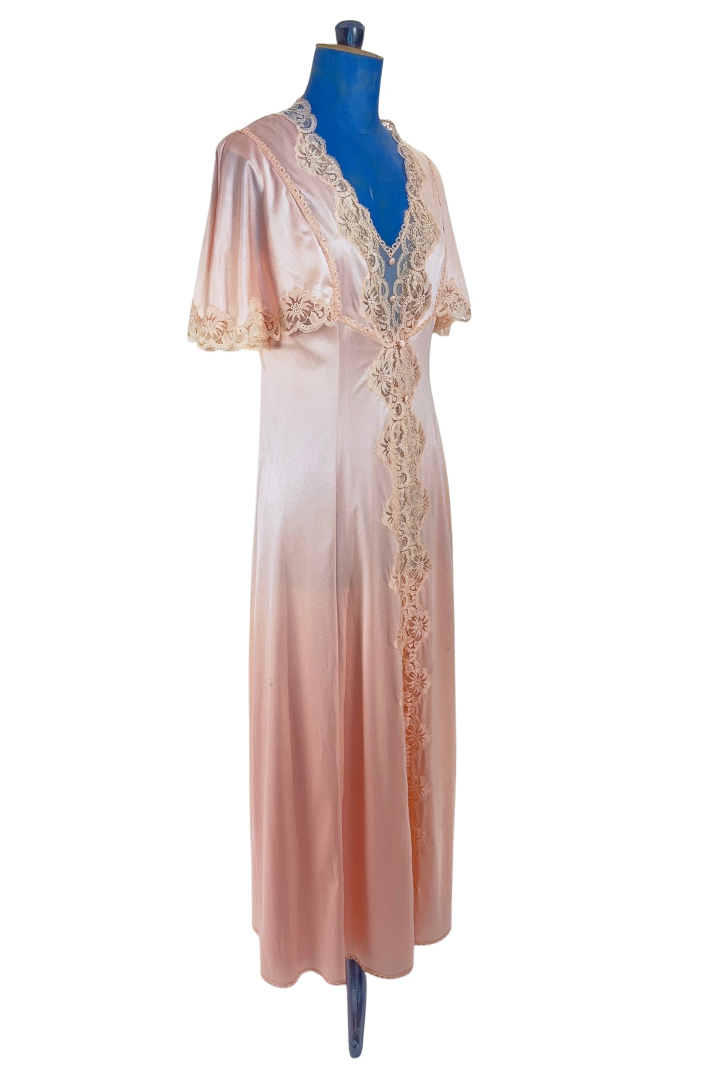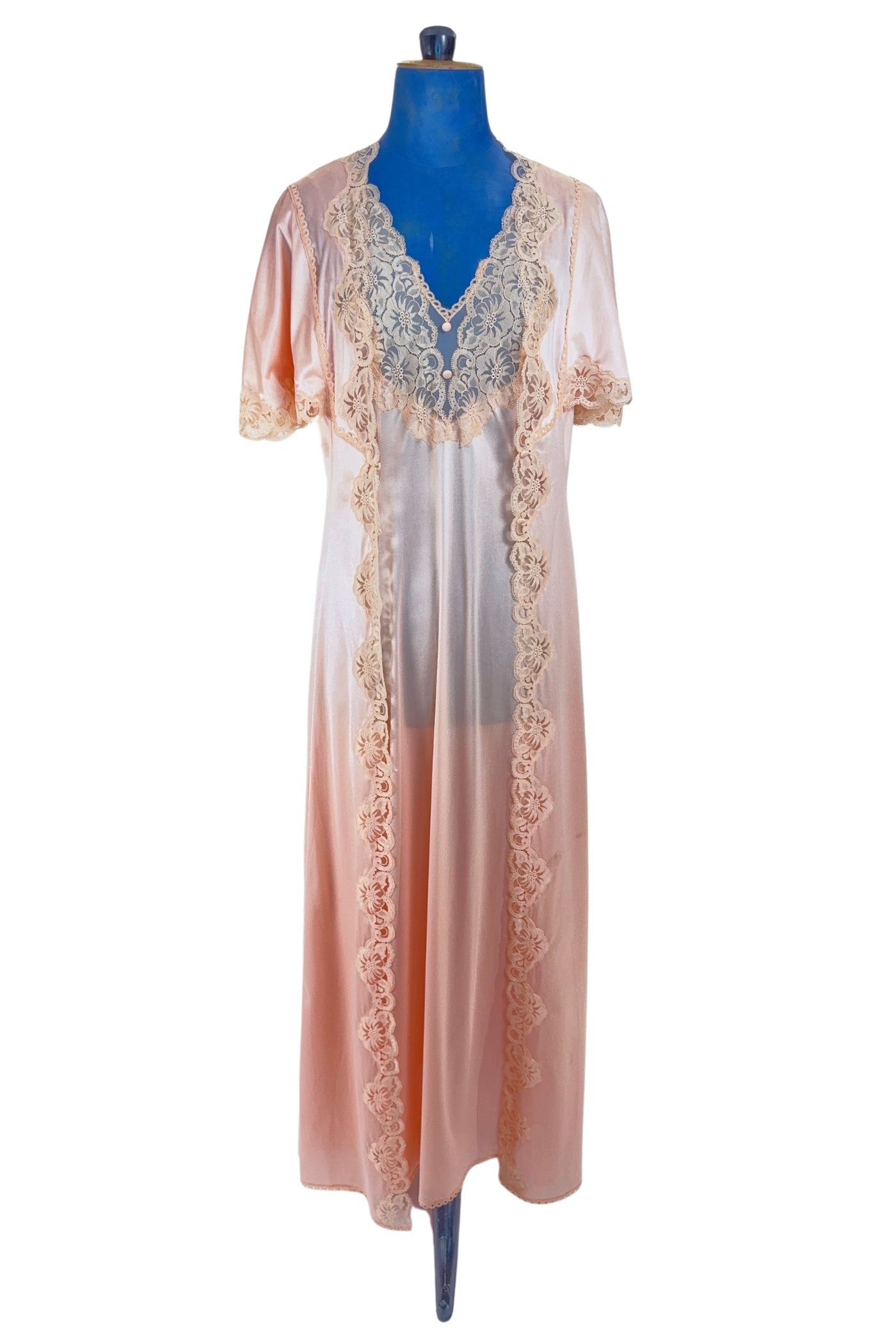 This early 1970s vintage peignoir set by Valisère includes a robe and matching nightgown in peach nylon with inset lace at the bust, down the front of the robe, and along the edges of the robe's short flutter sleeves. Two tiny covered fabric buttons add a dainty touch at the bust.