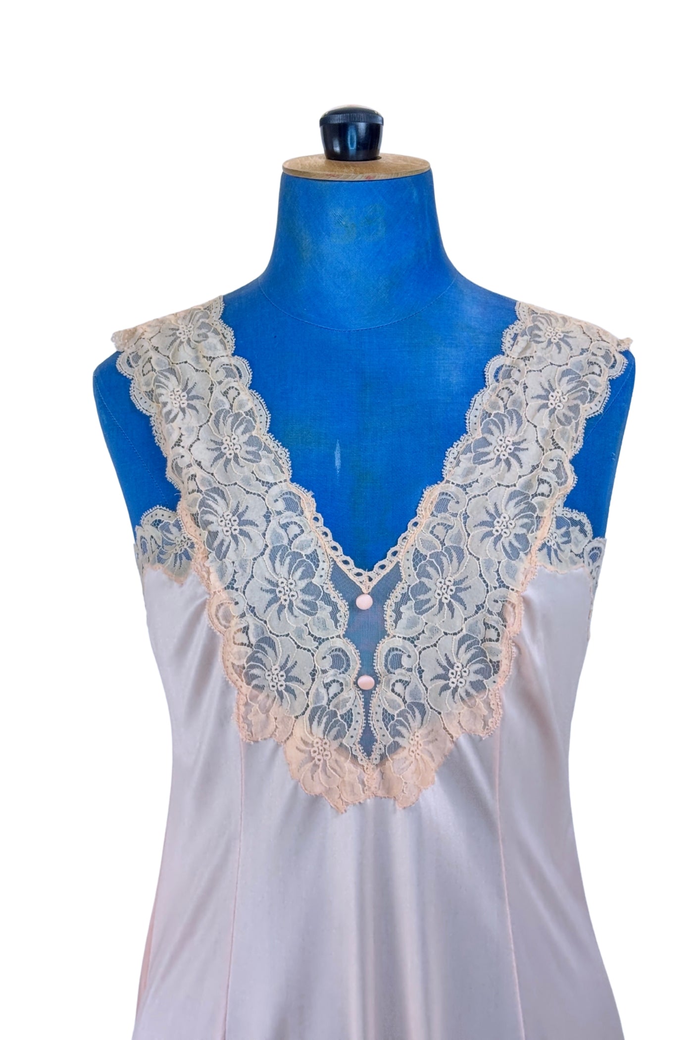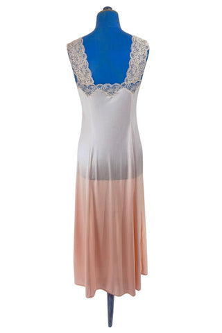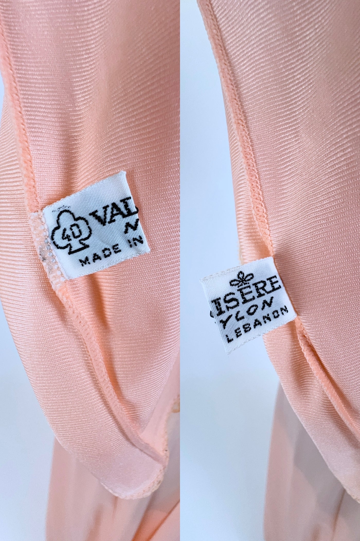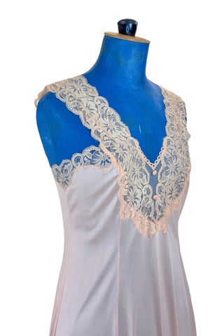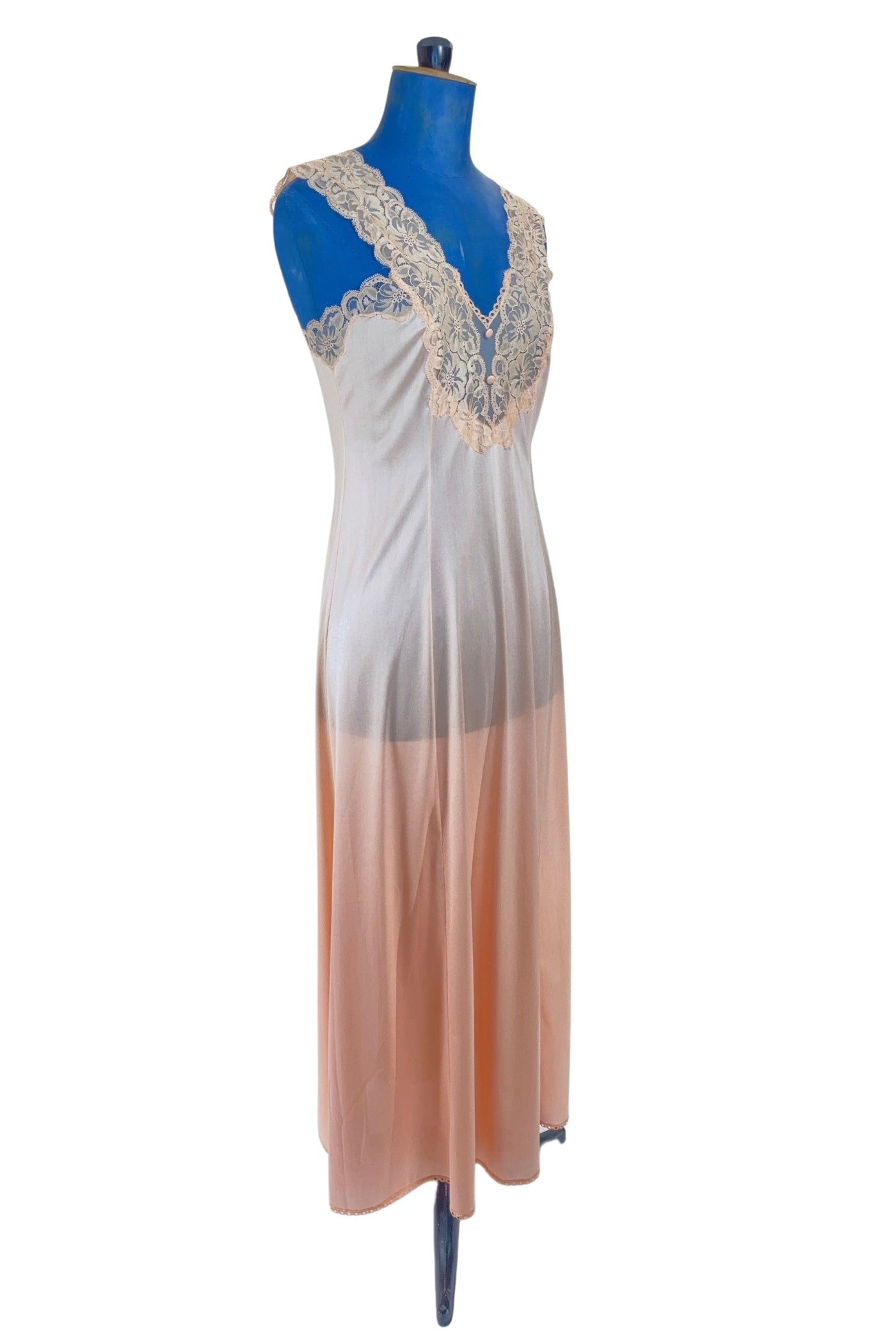 This early 1970s vintage peignoir set by Valisère includes a robe and matching nightgown in peach nylon with inset lace at the bust, down the front of the robe, and along the edges of the robe's short flutter sleeves. Two tiny covered fabric buttons add a dainty touch at the bust.