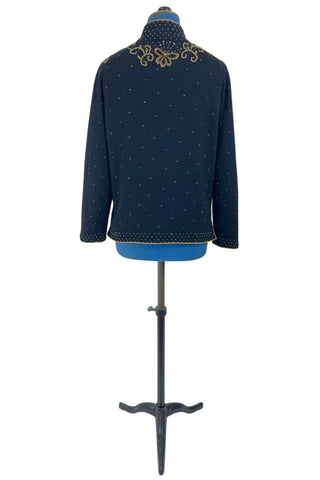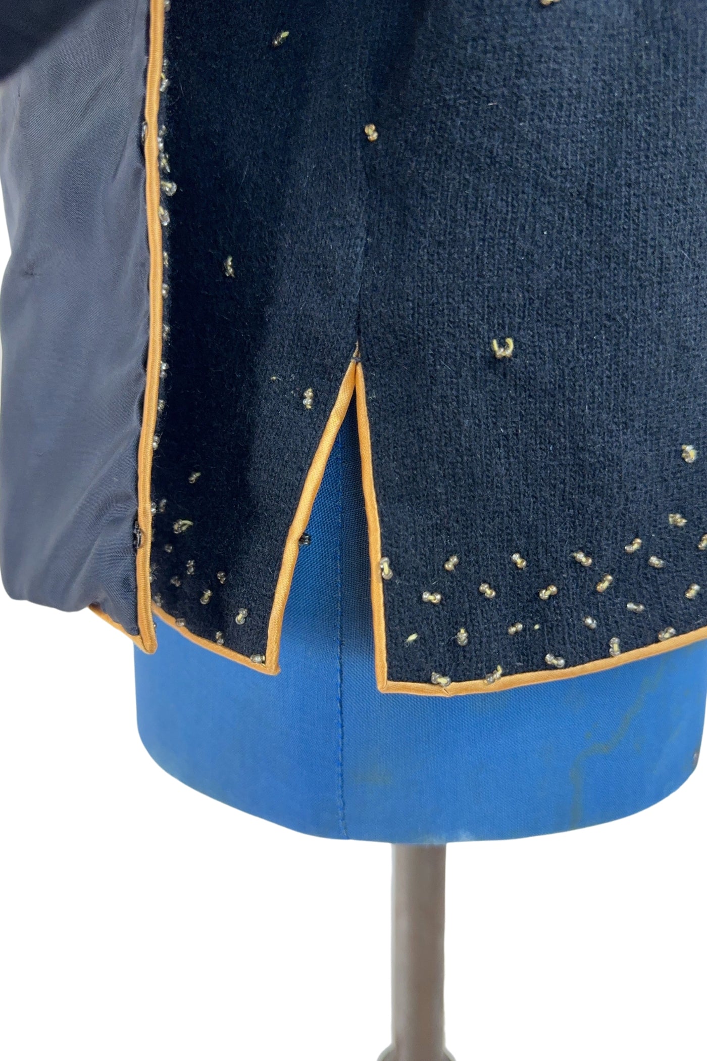 Heavily beaded vintage 1950s cashmere sweater. The rich, black wool sweater is trimmed at the collar, front placket, and hem with gold silk satin piping. Closes with tiny hooks and eyes down the front. The sweater has side vents at the waist/hips that optionally close with hooks and eyes.
