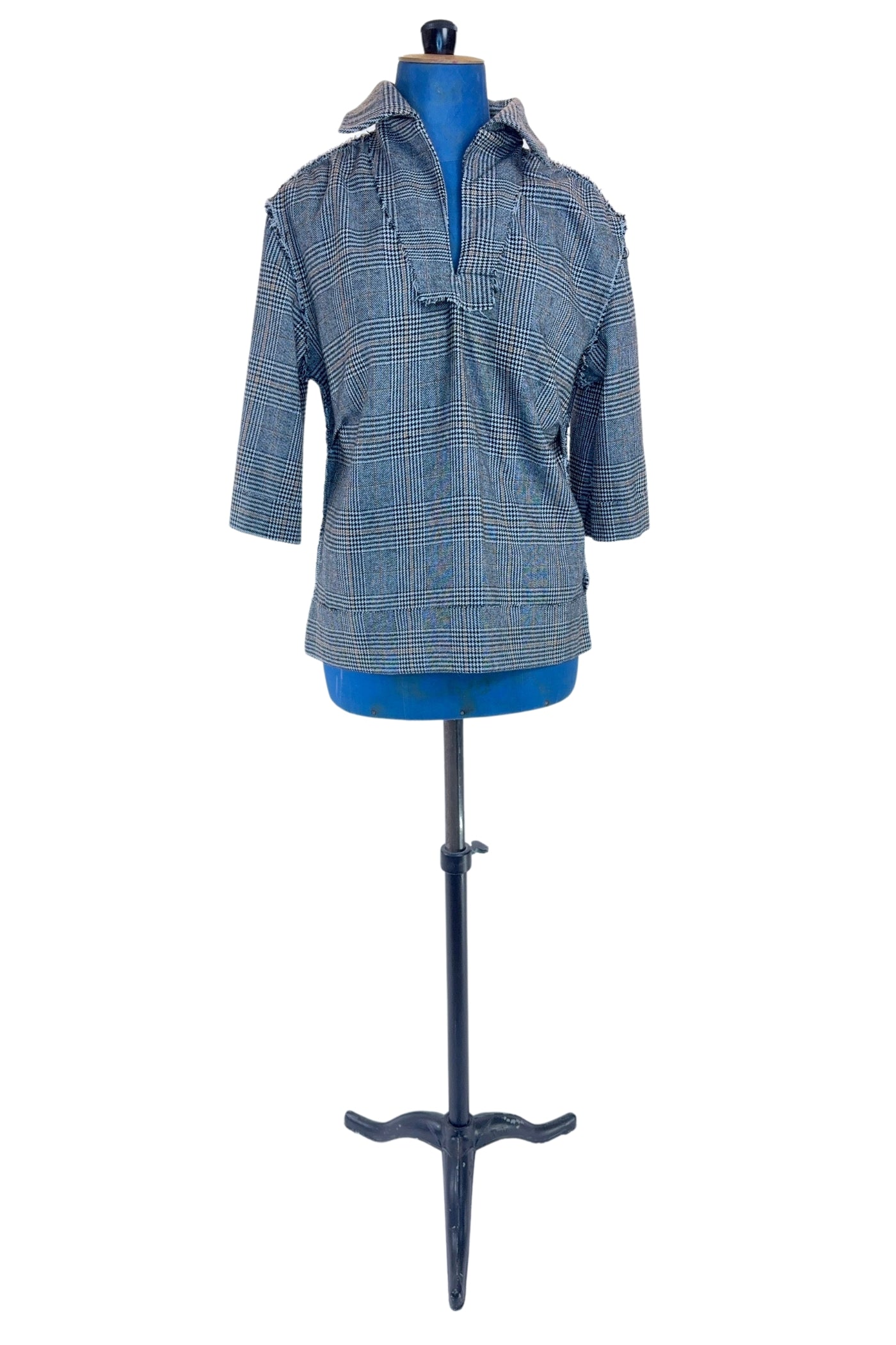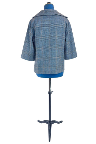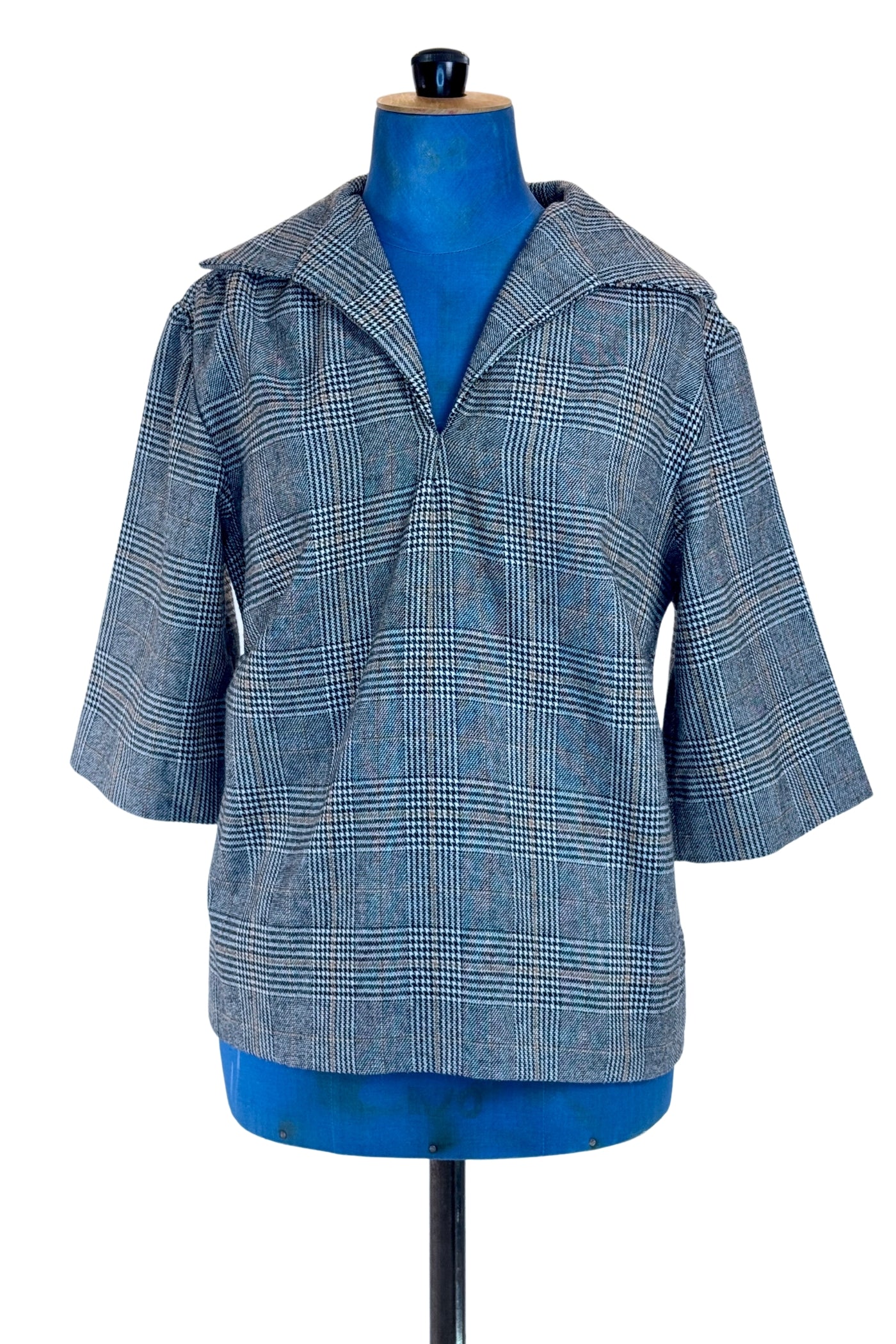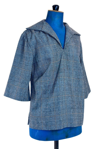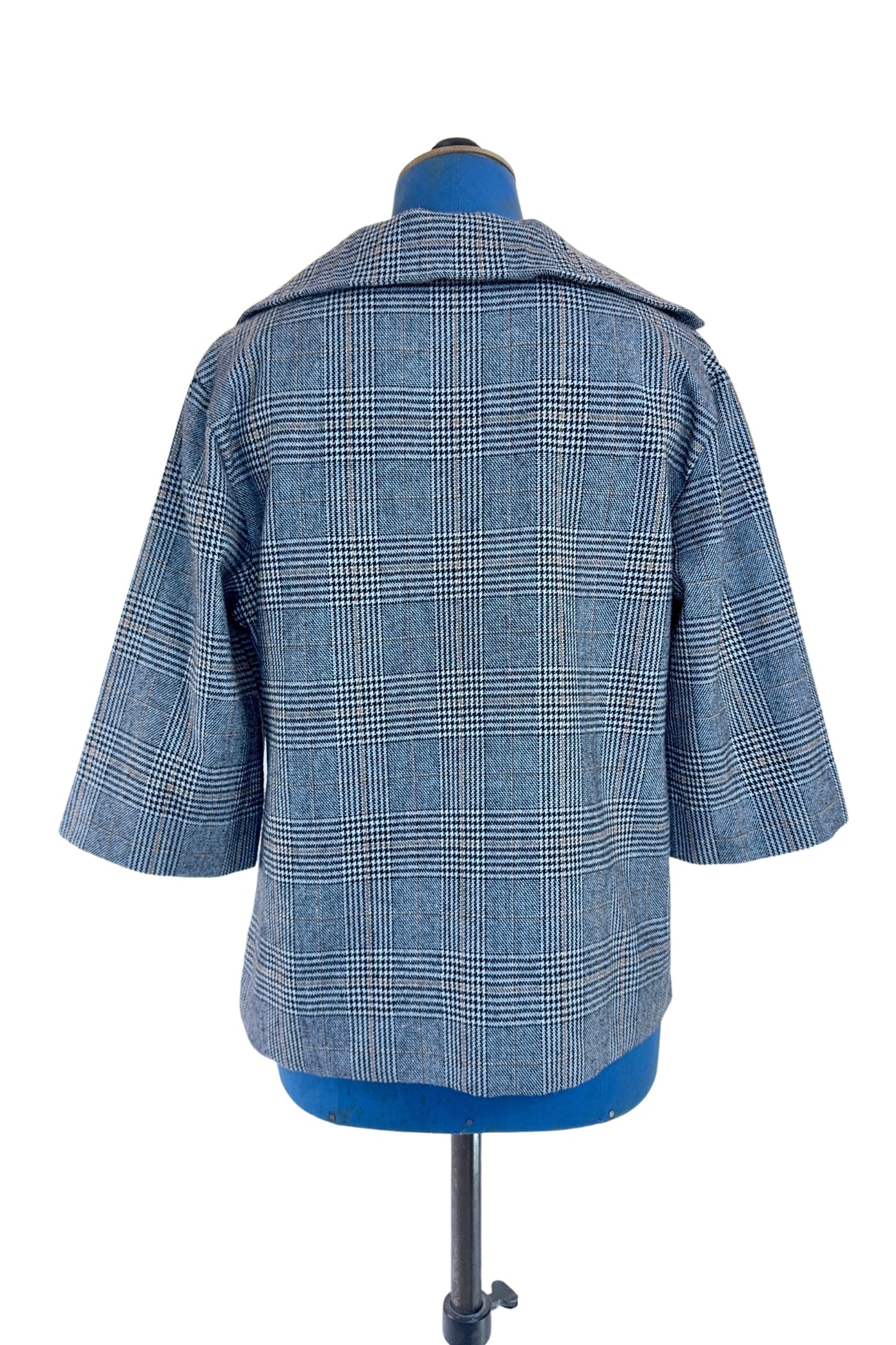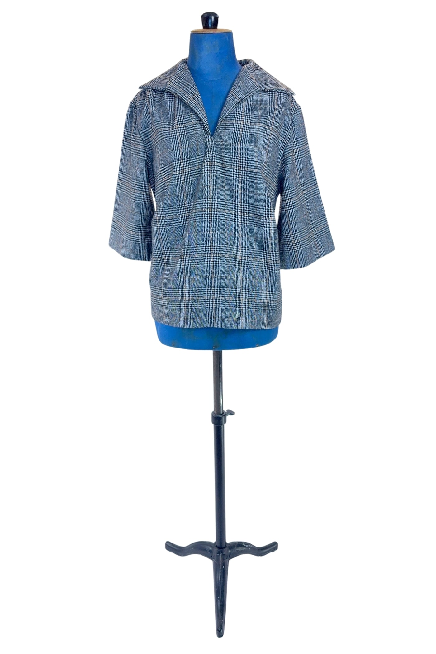 Toss on this effortless vintage 1960s wool top with jeans for a casual vintage vibe, or pair with skinny cigarette pants for an elevated daytime look. The medium-weight plaid fabric is a wool blend.