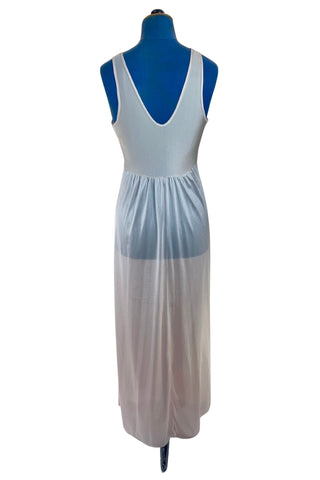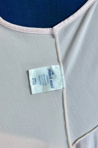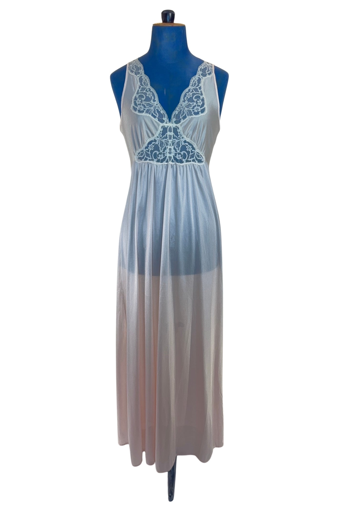 Dainty pink vintage nightgown with inset cream lace panels at the bust. The back has a deep scoop cut. The shell pink nylon material has a slight sheen and a bit of stretch.